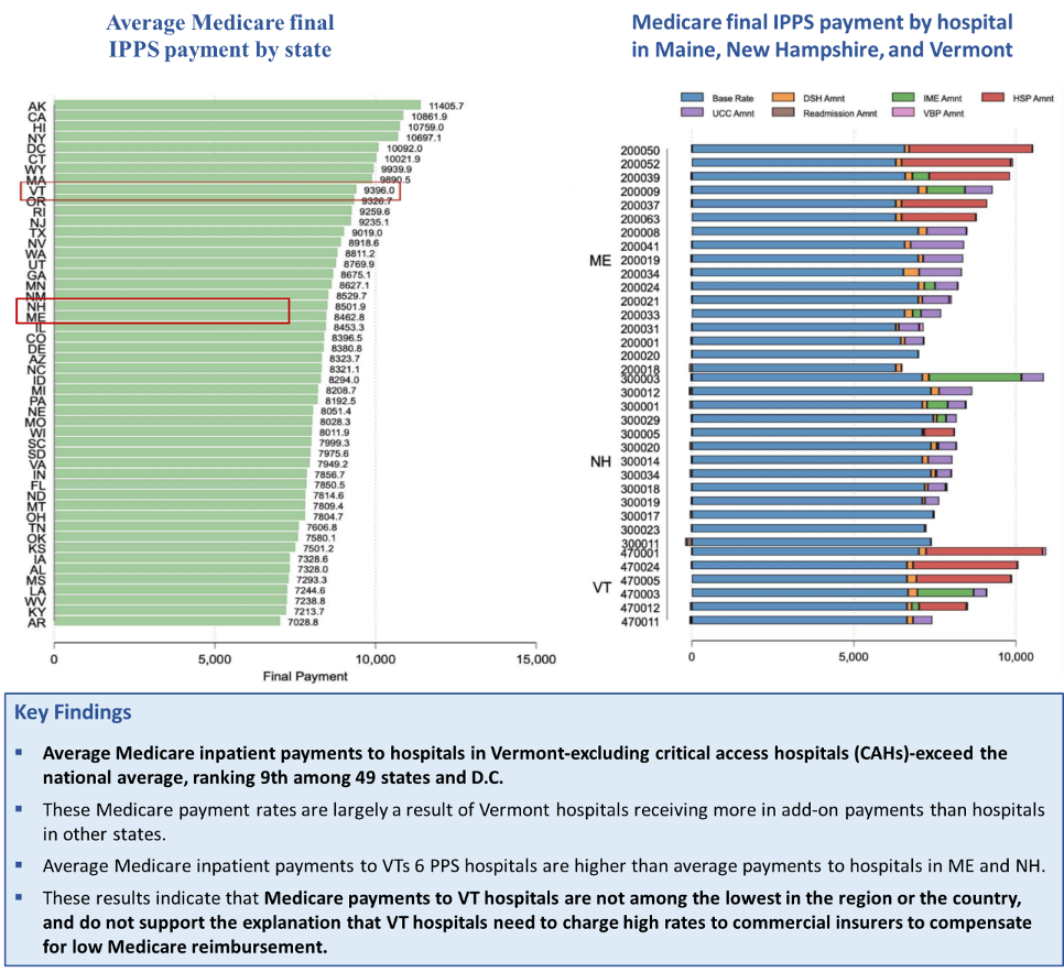 In November 2025, a team of economists at the Center for Advancing Health Policy through Research (CAHPR) at the Brown University School of Public Health produced an analysis of Medicare Final Payment Rates in Vermont for the Green Mountain Care Board (GMCB). The analysis showed that average Medicare inpatient payments to Vermont hospitals (excluding critical access hospitals) exceeds the national average and ranks 9th highest among 49 states and the District of Columbia (Maryland is excluded from the analysis due to operating under global budgets).