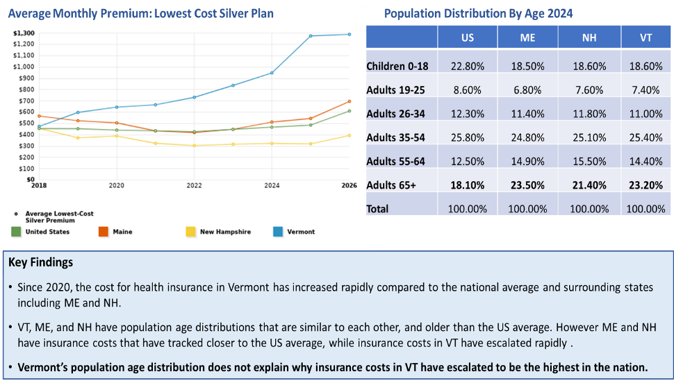 In New Hampshire, commercial insurance costs are lower than the US national average and the state has the lowest proportion of monthly income that goes to pay for health insurance, while VT has the highest. Vermont is, on average, slightly older than New Hampshire but nothing that comes close to explaining these cost deviations.